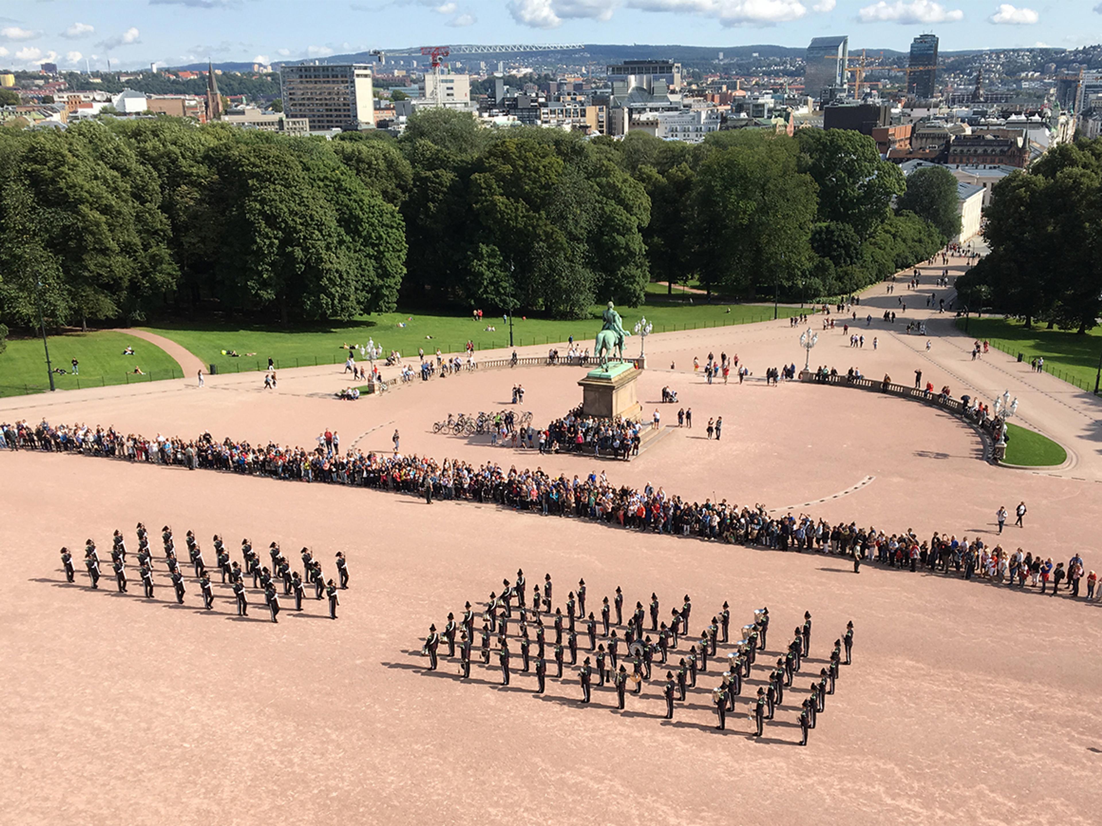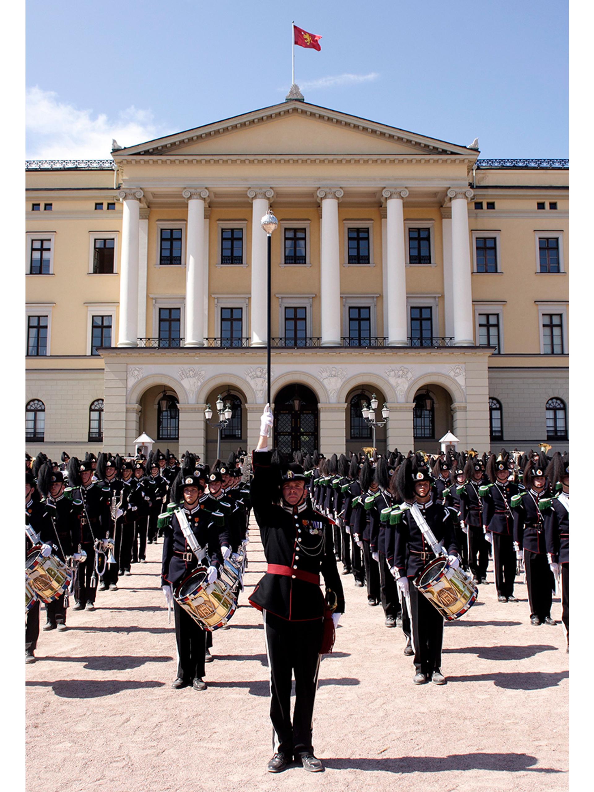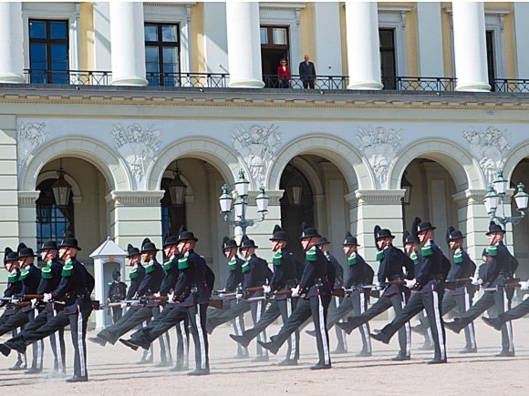 During the summer, members of the King’s Guard march through the streets of downtown Oslo. Led by a Norwegian military band, the parade begins at Akershus Fortress at 13.10 with mounted police at the head. The parade route extends from the fortress square, via Kirkegaten to Karl Johan Street and up to the Royal Palace. The parade arrives at the Palace Square at about 13.30 and then performs the changing of the guard ceremony.