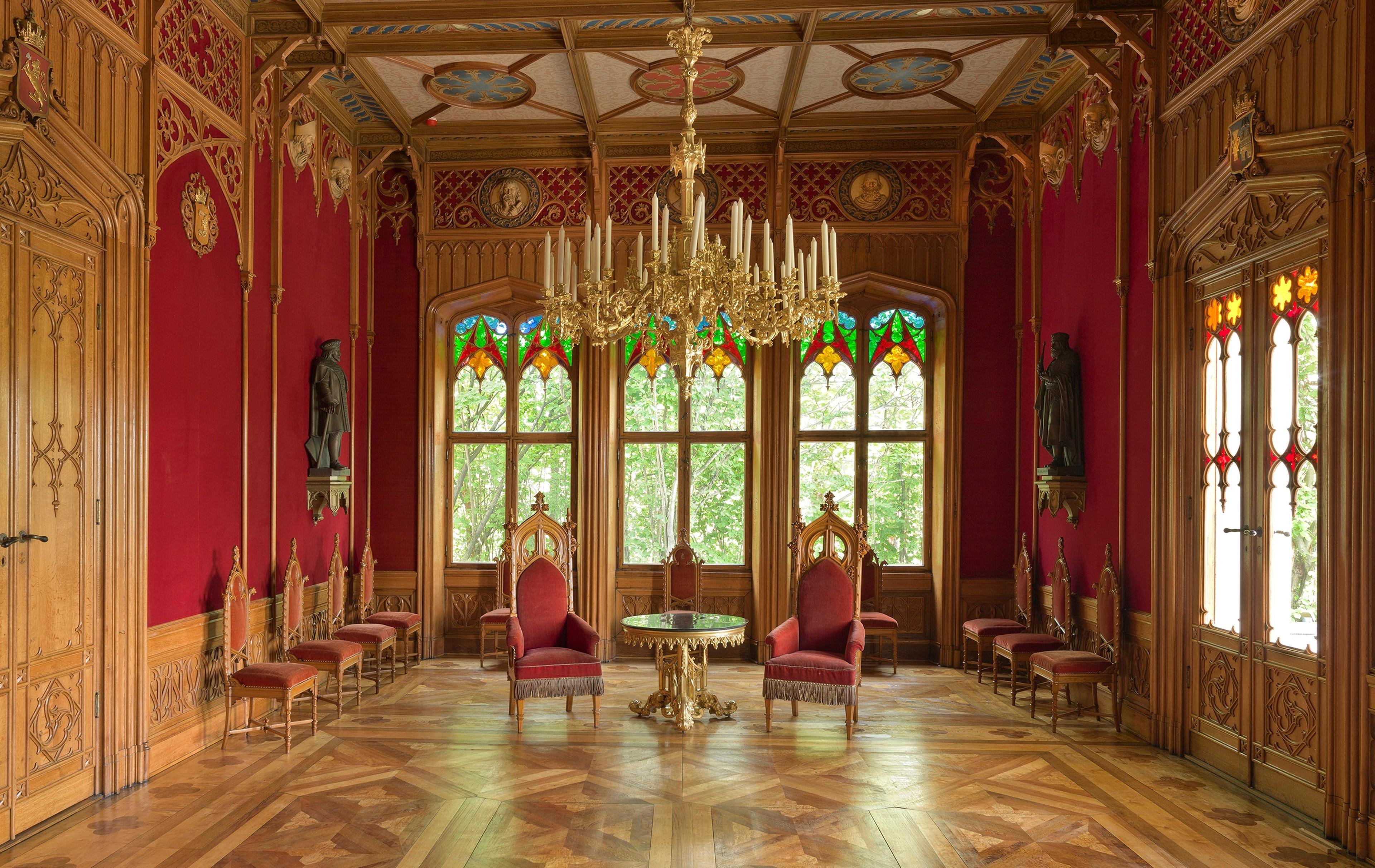 Along the walls of the Drawing Room there are 18 high-backed Neo-Gothic chairs, upholstered in the same red velvet as the walls and featuring the monogram of King Oscar I embroidered in the back. Two armchairs, said to be used by King Oscar I and Queen Joséphine when they received guests, stand on the floor of the room on each side of a gilded, marble-topped round table.