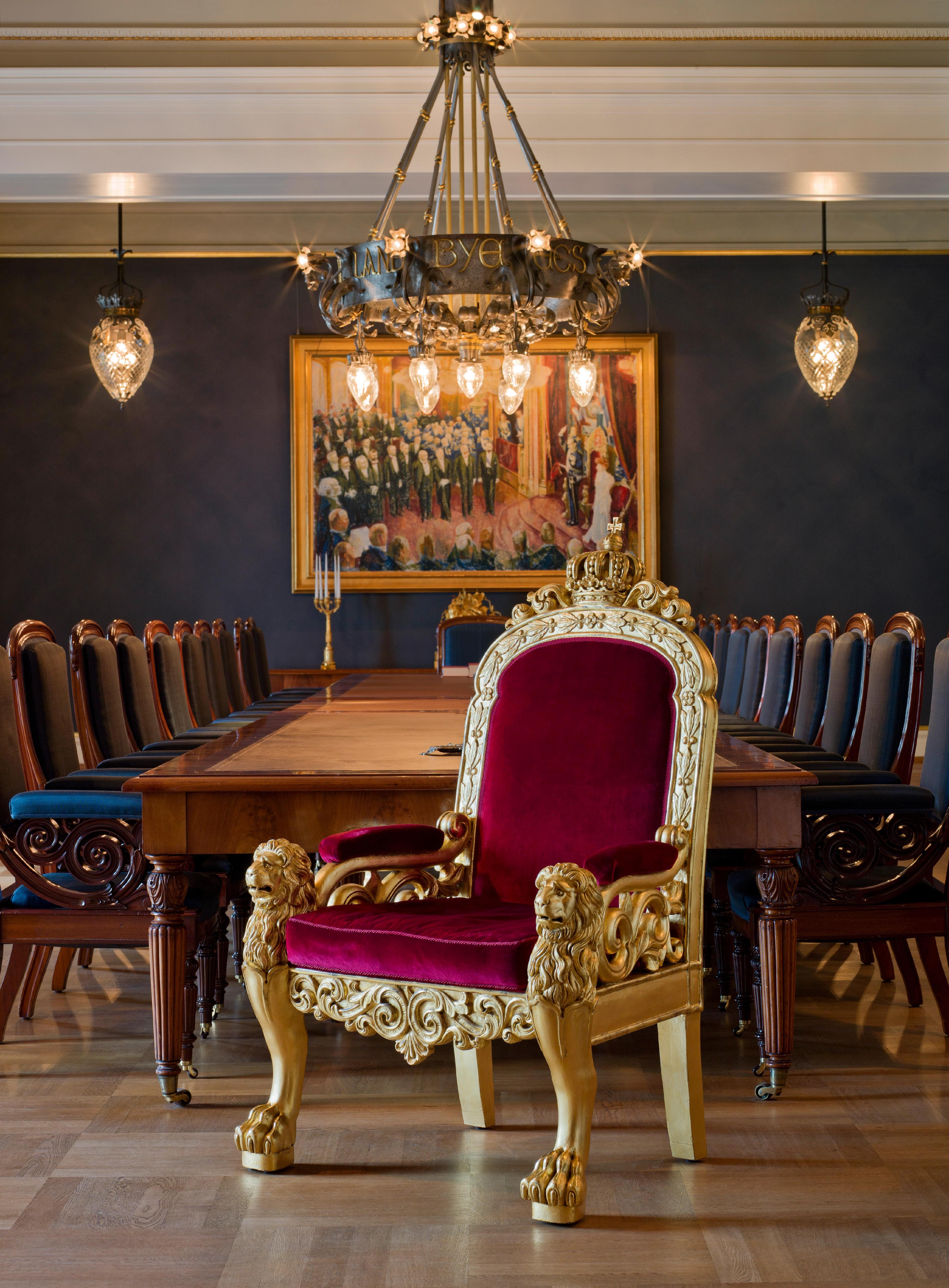 Above the large table hangs a wrought-iron chandelier in Art Nouveau style from 1901, designed by architect Jørgen Berner. It bears the inscription “By law shall the land be built” in gilded letters. The quotation is taken from the Frostating Law, as it was written down around 1260. The chandelier was installed in 1901, when the Palace was fitted with electric lighting.