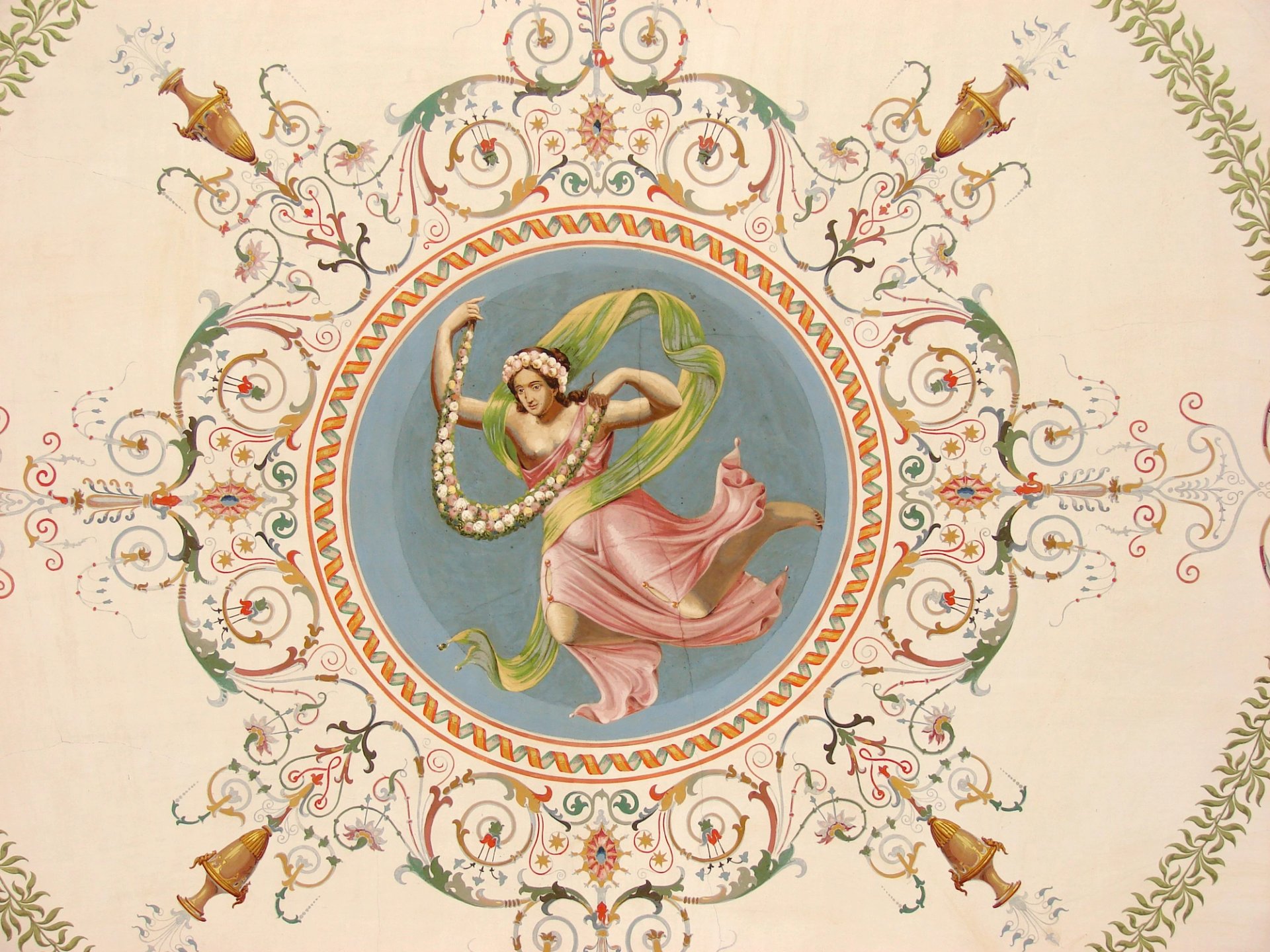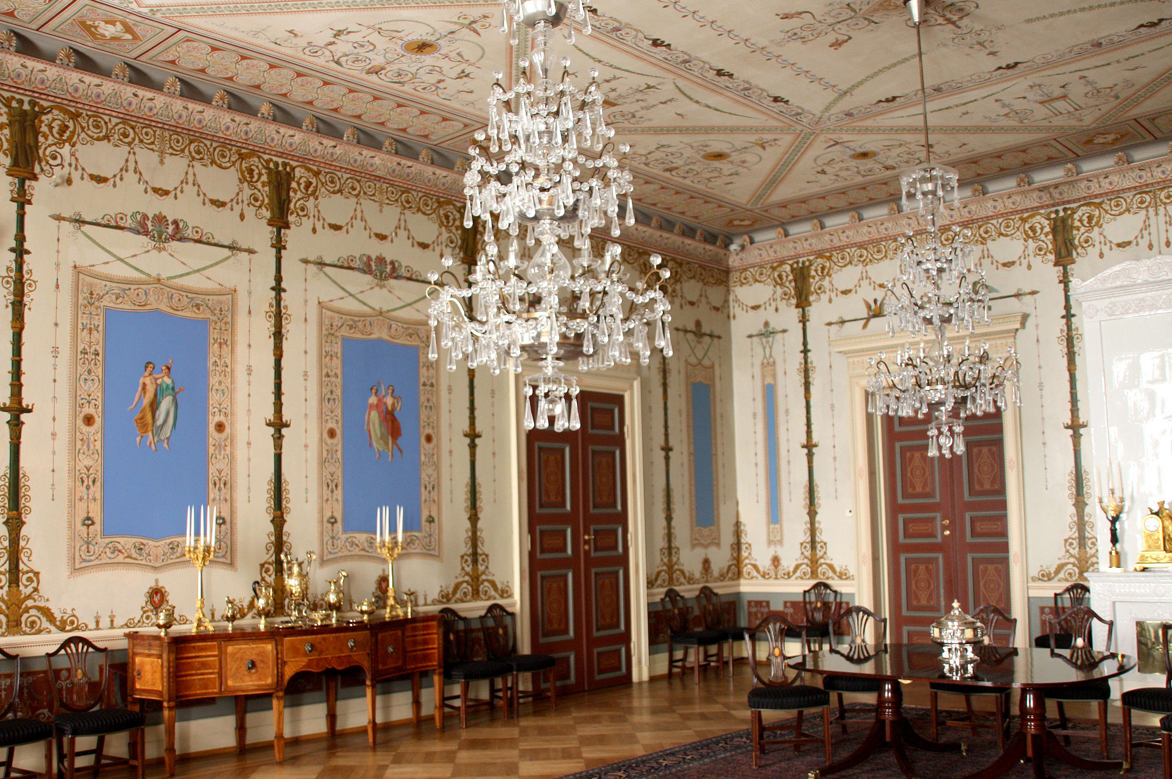 Palace Architect Linstow wanted the dining room to have a calm yet festive interior and décor. He chose to have the walls painted in the Pompeian style. This was very fashionable at the time, while the costs remained relatively low.
