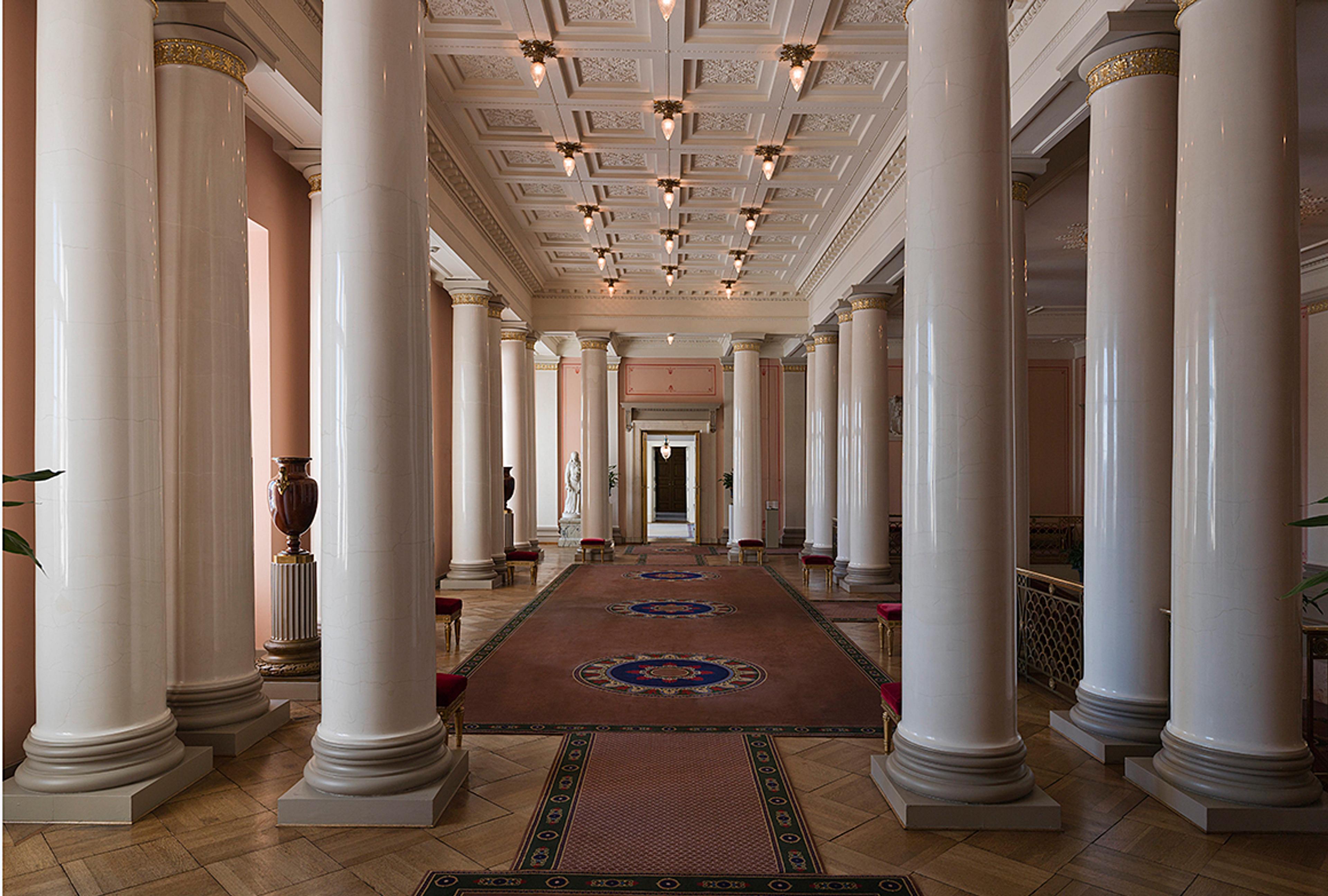 The walls are painted according to Linstow’s original plan, in a pink distemper with vermilion red line decoration featuring palmettes, while the columns are a creamy white.